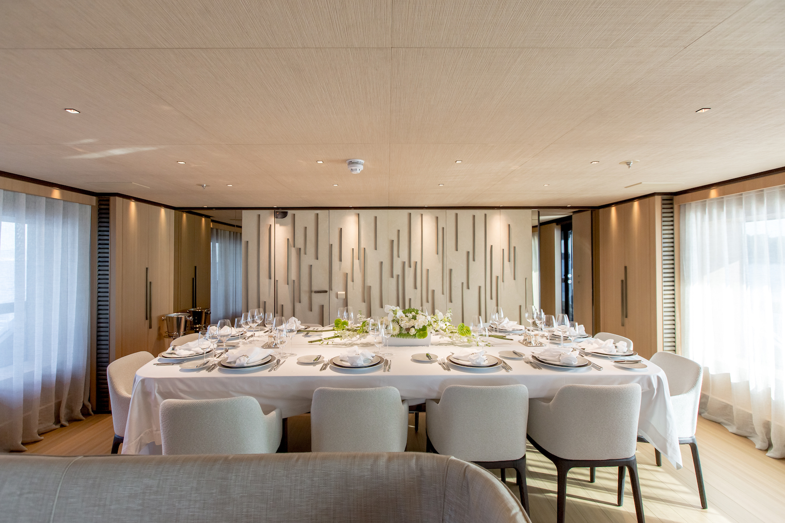 Her main deck offers a large salon area with formal dining forward. The luxurious Master stateroom and VIP cabins are forward of the salon and dining. An upper deck offers a sky lounge aft and the bridge forward.
