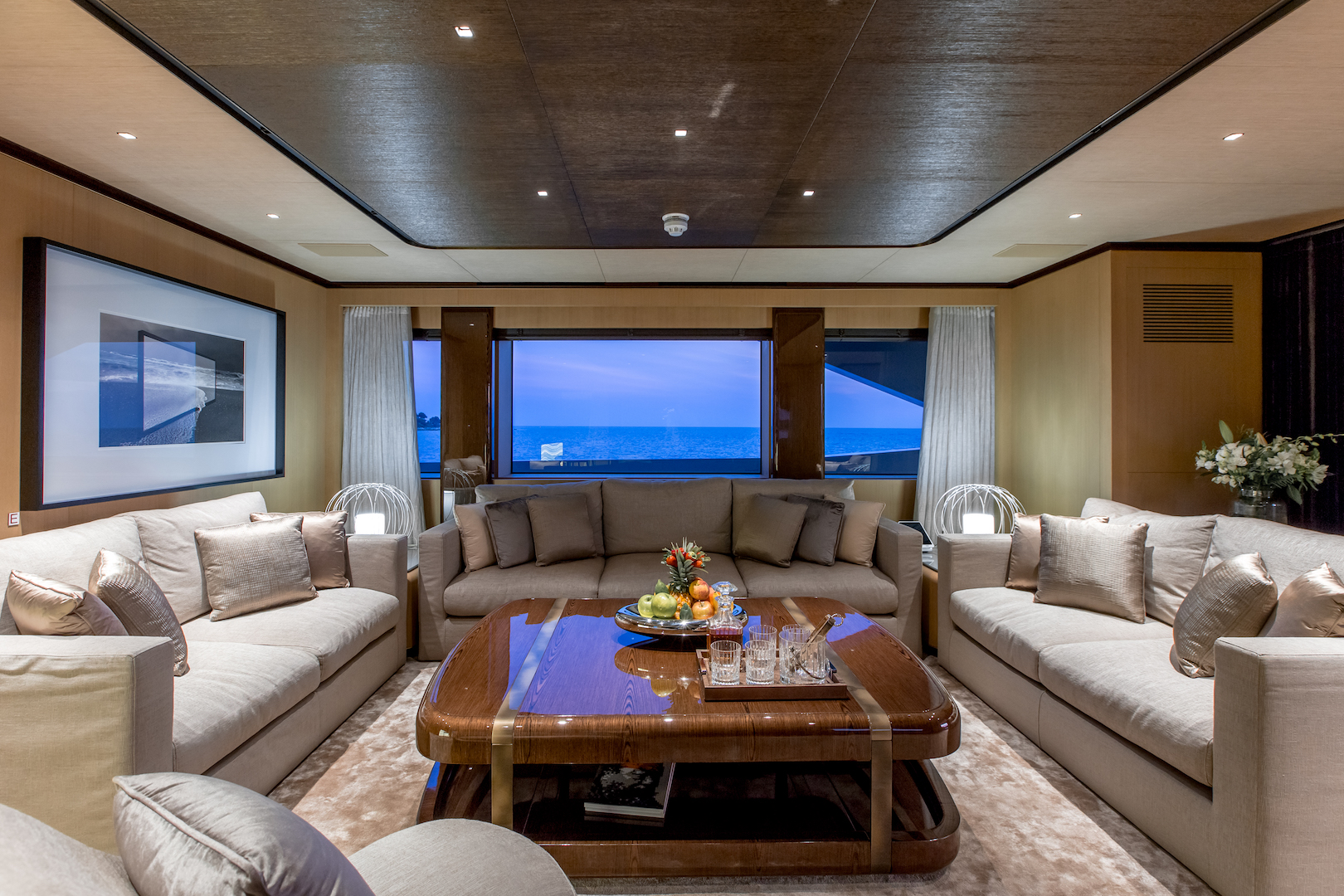 Her main deck offers a large salon area with formal dining forward. The luxurious Master stateroom and VIP cabins are forward of the salon and dining. An upper deck offers a sky lounge aft and the bridge forward.