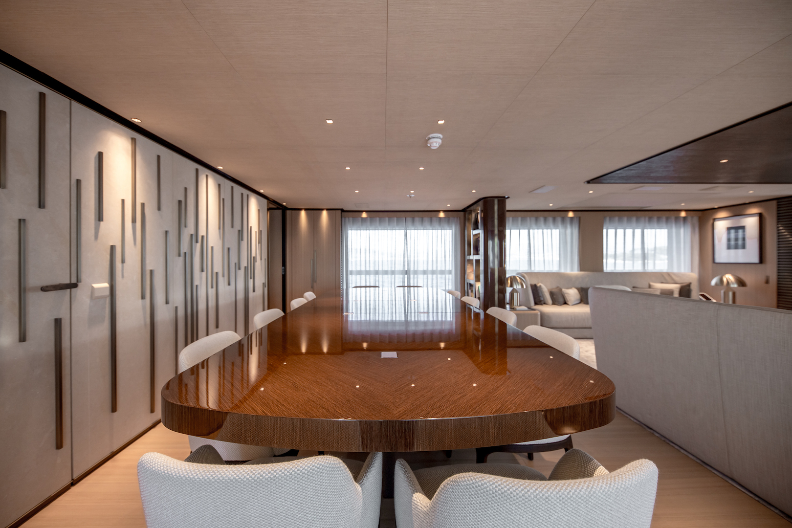 Her main deck offers a large salon area with formal dining forward. The luxurious Master stateroom and VIP cabins are forward of the salon and dining. An upper deck offers a sky lounge aft and the bridge forward.