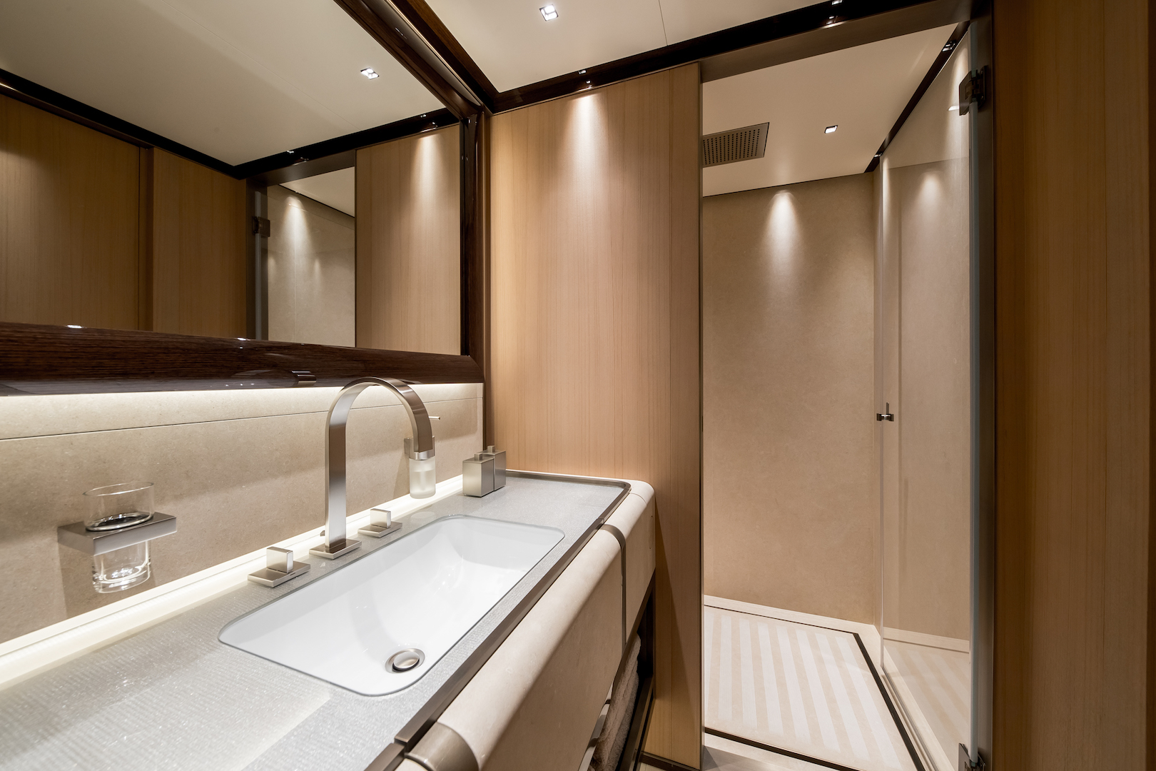 The luxurious Master stateroom and VIP cabins are forward of the salon and dining. An upper deck offers a sky lounge aft and the bridge forward. Tankoa superyacht Vertige provides deluxe accommodation in six cabins, including the main deck full-beam master and VIP suite, as well as four lower deck cabins for up to 12 charter guests.