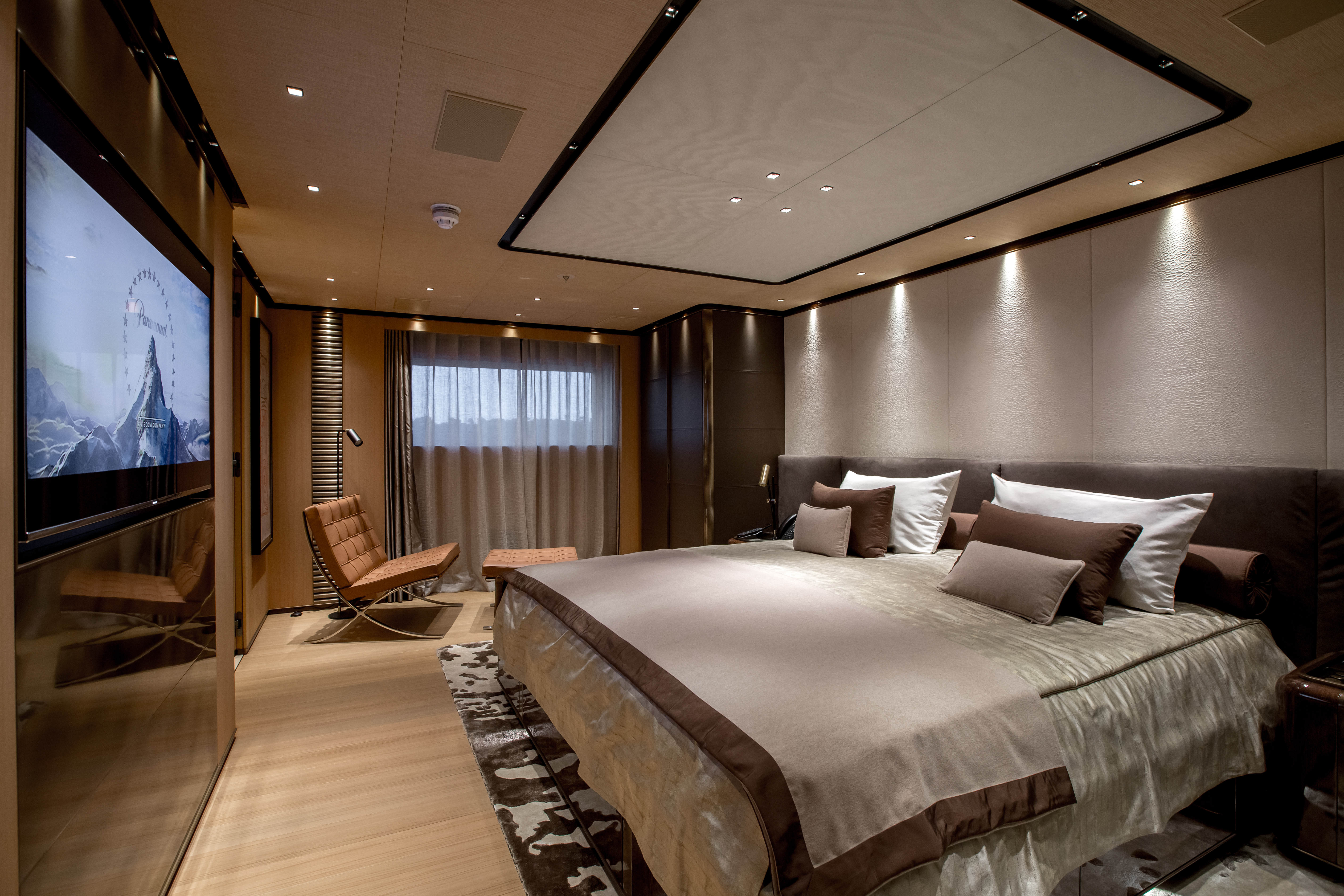 The luxurious Master stateroom and VIP cabins are forward of the salon and dining. An upper deck offers a sky lounge aft and the bridge forward. Tankoa superyacht Vertige provides deluxe accommodation in six cabins, including the main deck full-beam master and VIP suite, as well as four lower deck cabins for up to 12 charter guests.