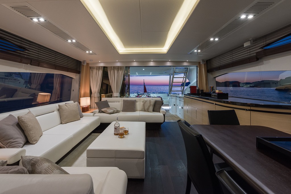 The Sunseeker crewed charter yacht SEAWATER has exceptional exterior deck space. On the main deck adjacent to the salon, is the shaded aft deck and alfresco dining option. Further aft is a large double sunpad. For the active in the group, an extended swim platform ensures effortless water access, to the good selection of water toys available.