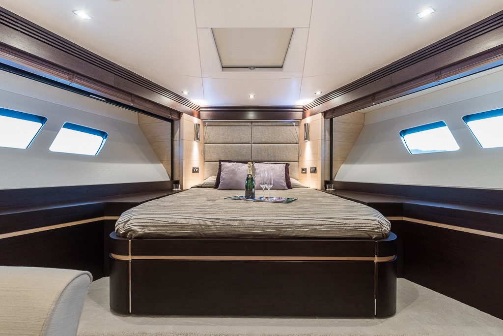Further aft is a large double sunpad. For the active in the group, an extended swim platform ensures effortless water access, to the good selection of water toys available. Side decks wrap around the yacht, leading to the well-appointed foredeck, where a further alfresco dining option and double sunpad await.
