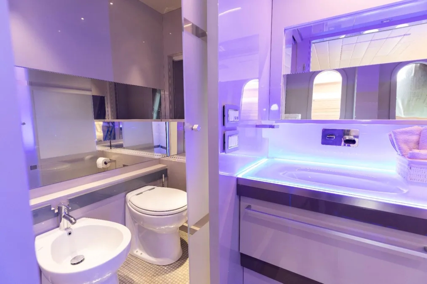 Elongated side windows provide ample natural light, while fitted remote blinds allow for optimum TV entertainment. Below decks are 4 guest cabins, each featuring a great choice mood lighting.