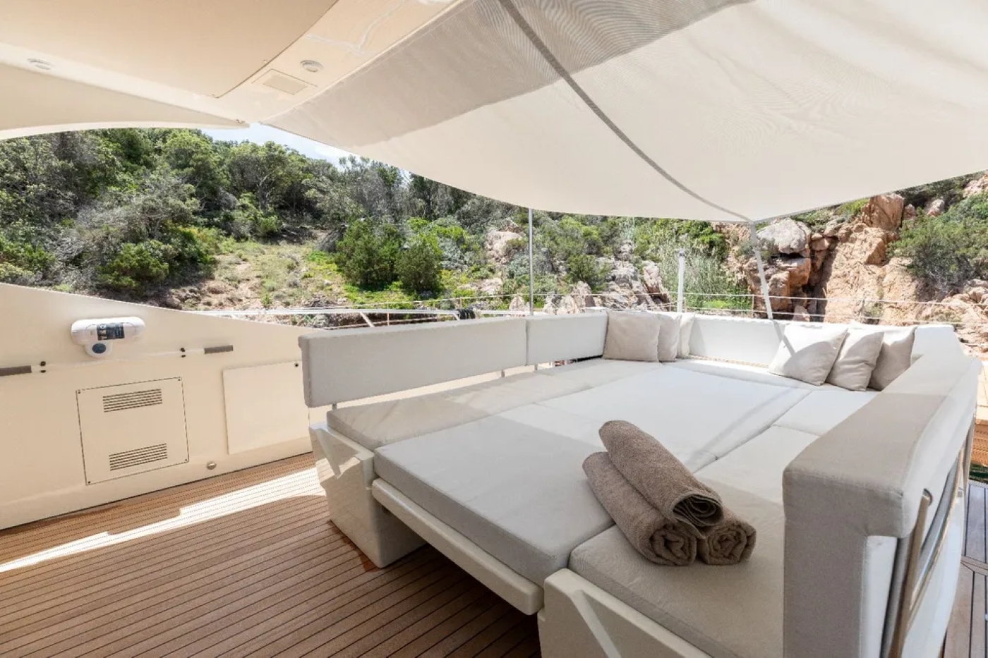 Exterior living is plentiful. The aft deck boasts direct access to the salon and features a centered alfresco dining option, perfect for entertaining. The transom has full beam steps leading to the extended swim platform, ideal for enjoying the water toys on offer, with ease.