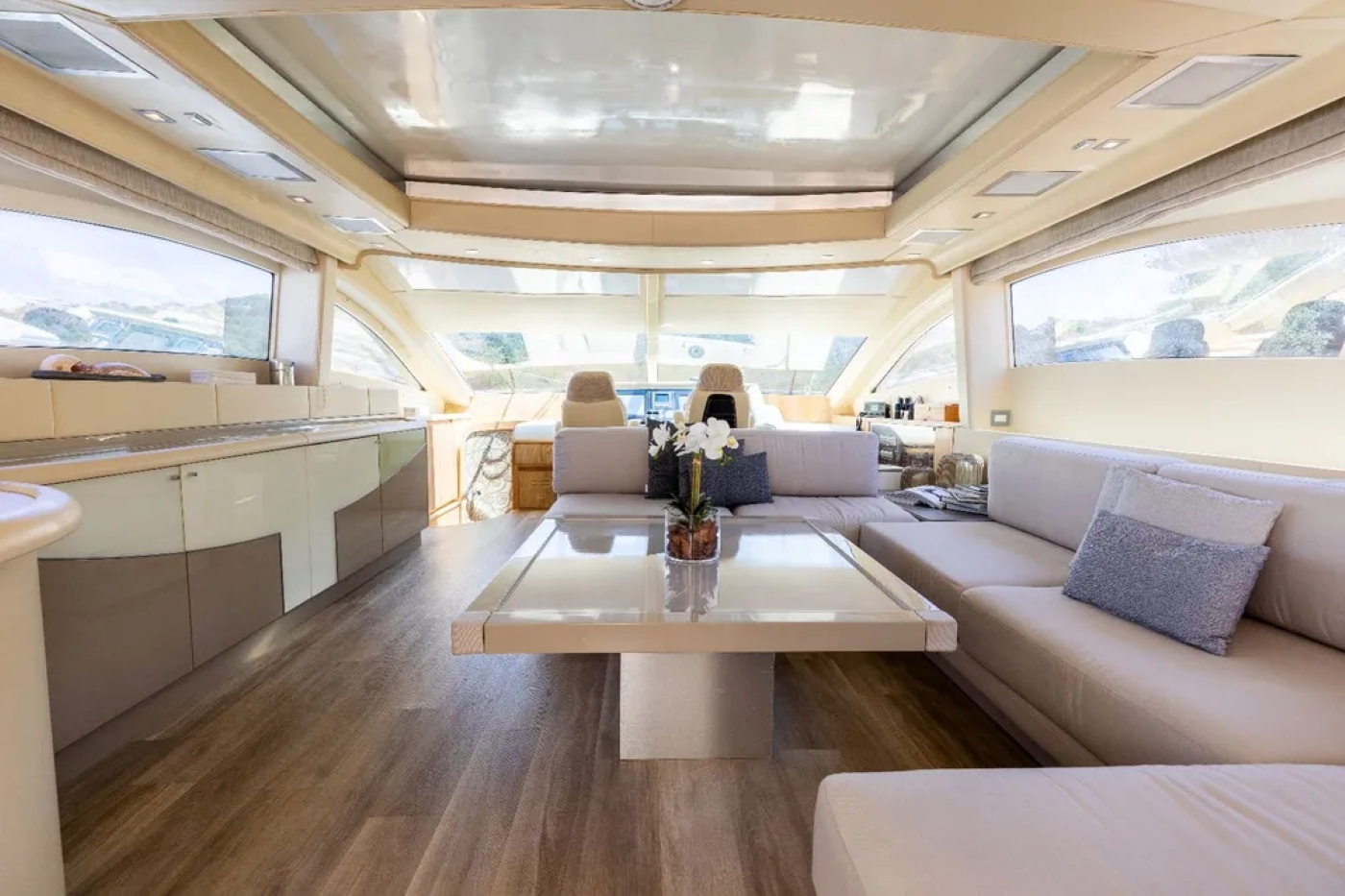 Crewed charter yacht YACHTMIND has a contemporary neutral interior décor of earthy tones and light creams, creating a soothing ambiance. The salon offers a generous lounge with a U shaped plush leather sofa, large table and full entertainment systems.