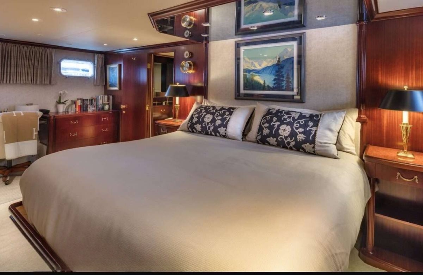 The master stateroom is amidships and full beam of the yacht, with a queen size walk around bed. The VIP cabin is forward and full beam of the yacht, with a center lined queen size bed. A guest cabin on the starboard side has side by side single beds, while a further guest cabin has a lower single bed and an upper Pullman berth.
