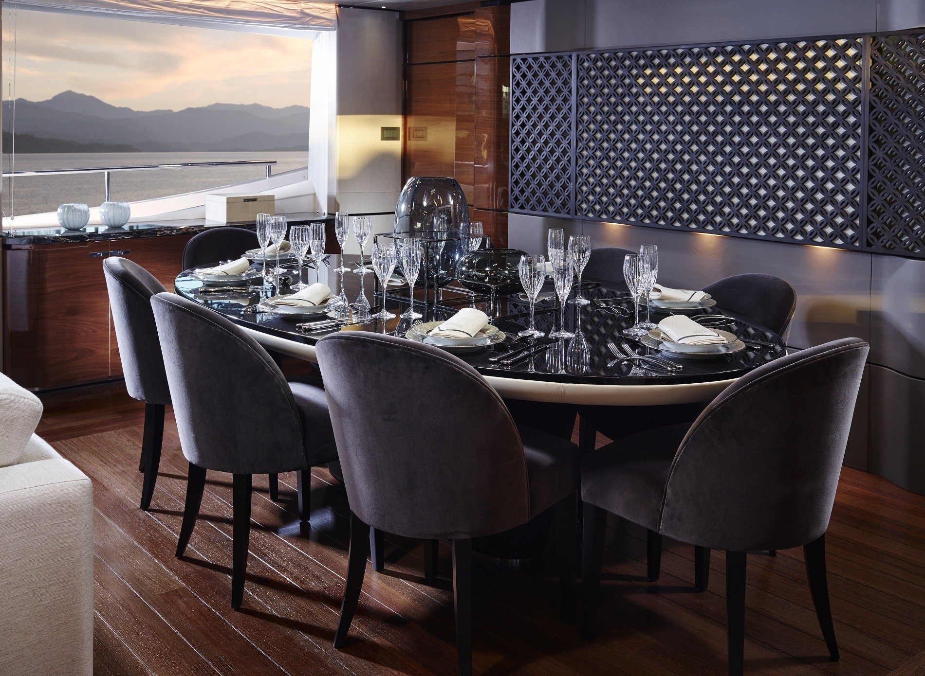 The aft cockpit features a relaxed and spacious seating area, complemented with a wet bar and shaded beneath the flybridge overhang. Twin transom gates lead to the hydraulic bathing platform and stern garage, which can store a 4,5m tender.