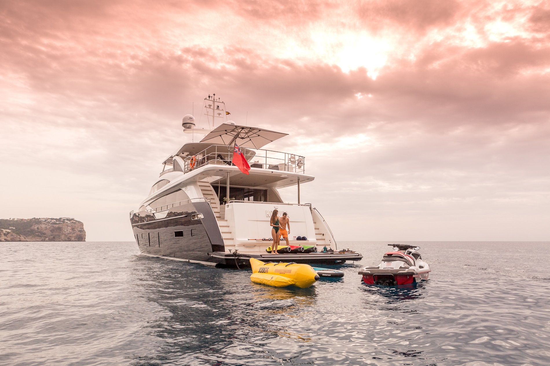 The aft cockpit features a relaxed and spacious seating area, complemented with a wet bar and shaded beneath the flybridge overhang. Twin transom gates lead to the hydraulic bathing platform and stern garage, which can store a 4,5m tender.