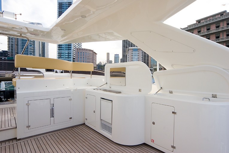 Forward of the salon on the main deck is the master stateroom, while above is the main helm station. Further guest accommodation is ...