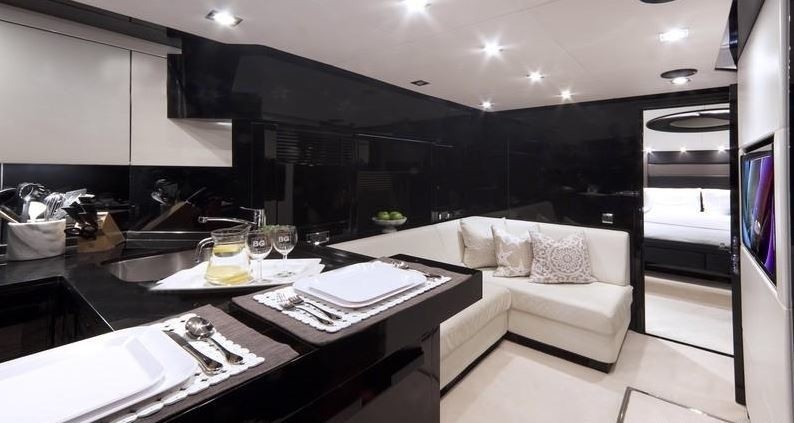 The master suite is full beam of the yacht, with a center lined king size bed, sofa and vanity. The VIP cabin is forward and full beam of the yacht, with a center lined queen size bed. A guest cabin offers 2 side by side twin beds. M/Y BG3 is fully air conditioned for optimum comfort.