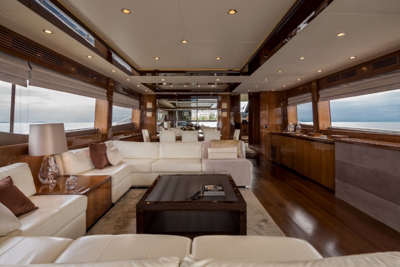 The salon offers a generous lounge with plenty of plush seating, a coffee table and entertainment aft, while forward is a formal dining table, easily seating all 8 guests in style. The foyer on starboard leads to a day head, steps to the lower deck guest accommodation and pilot house forward.