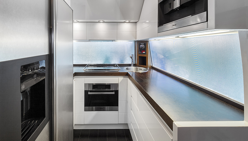 The yachts light and airy interiors are contemporary and welcoming, featuring neutral toned soft furnishings and warm woods throughout.
