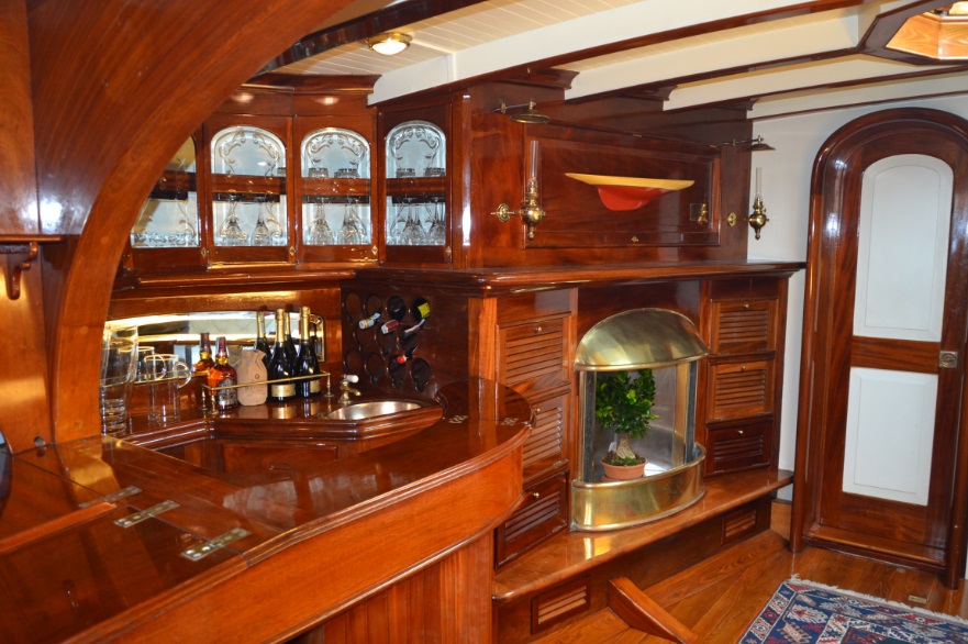 Forward, through a gently arched masterpiece of joinery, is the salon set in an open plan, featuring a formal dining area, integrated with a comfortable lounge, Piano, library and TV entertainment. On the port side of the salon are an opposing fireplace and complete wet bar.