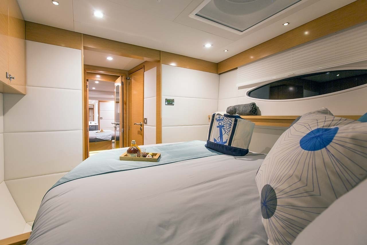 Forward of the salon is a further seating area and state of the art navigation station. Surrounding panoramic windows infuse the space with ample natural light and spectacular views. Aft of the salon, wide sliding glass doors bring the outside in, offering a fabulous entertaining venue.