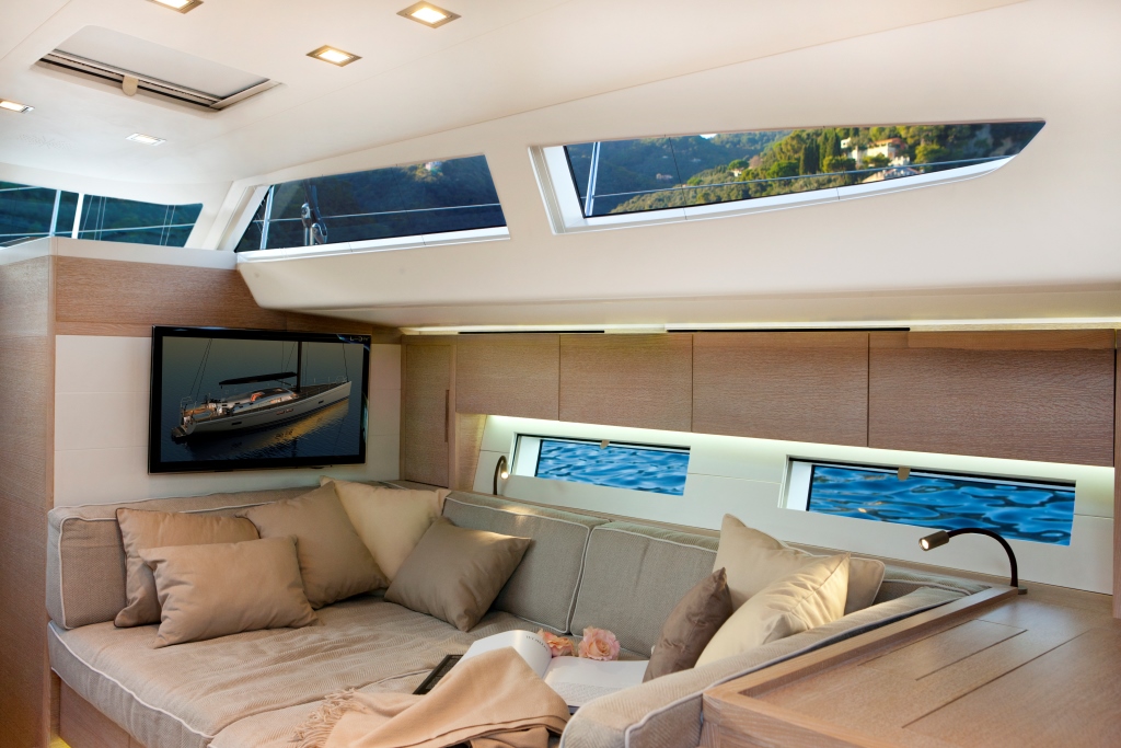 The salon and dining is an open plan, with the comfortable lounge and entertainment systems to starboard and formal dining to port. Pale wood floors and panels are complimented by neutral soft furnishings, while ample ports and hatches provide an abundance of natural light.