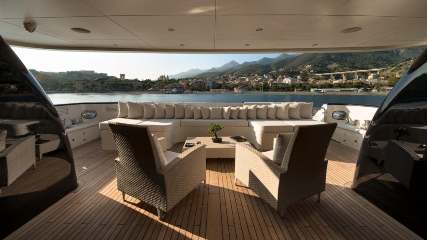 Forward in the salon is a state of the art entertainment system, while aft is direct access to the exterior aft deck. Thanks to panoramic windows, the salon boasts incredible light and an open, airy ambience.