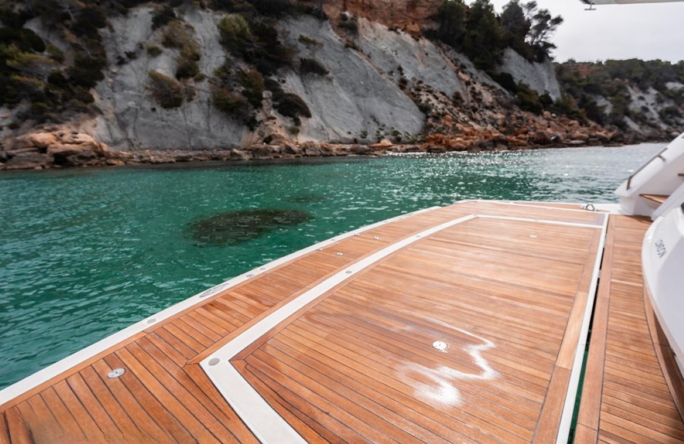 The aft deck has a dining setting for up to eight guests. The vast flybridge on the other hand is the perfect place for entertainment; there are two wet bars with an ice-maker, a fridge, a barbecue and a sink. The retractable inner canopy of the hard top can be adjusted to suite the needs the guests on board.