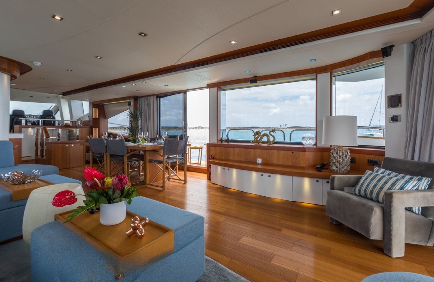 Accommodation is offered in one full-width master cabin boasting a king-sized bed, a walk-in wardrobe, a sofa, vanity area, a flat screen TV and the latest in entertainments systems; a large VIP cabin, a double cabin as well as on e twin cabin.