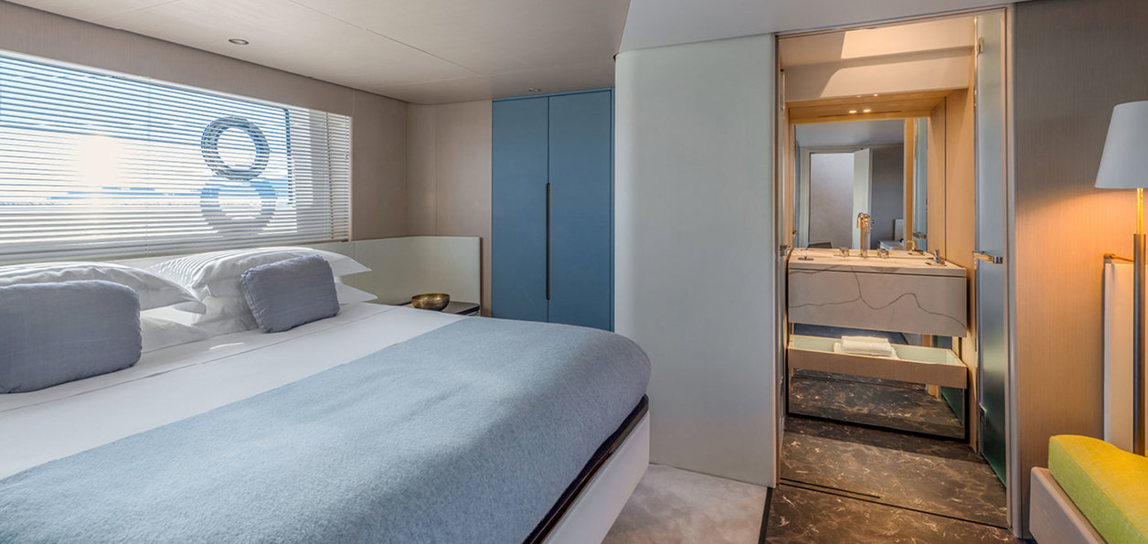 The retractable inner canopy of the hard top can be adjusted to suite the needs the guests on board. The bow features a further seating area as well as two sun pads.