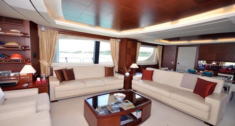 The salon and dining is an open plan, offering a generous lounge aft and formal dining forward. Surrounding elongated windows provide an abundance of natural light and scenic views. Further forward is the full beam master stateroom, with king size bed, seating area, vanity and en-suite with Jacuzzi tub and steam shower.