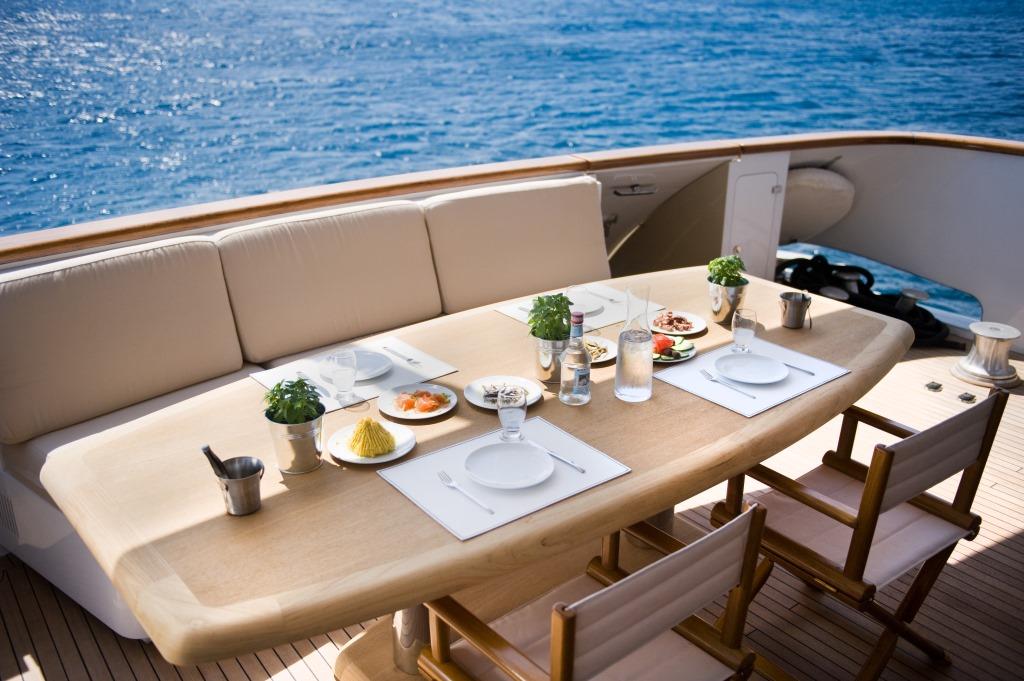 Outdoor living is well-appointed on 2 levels. The main salon leads out onto a partially shaded aft deck with an alfresco dining table and seating area.