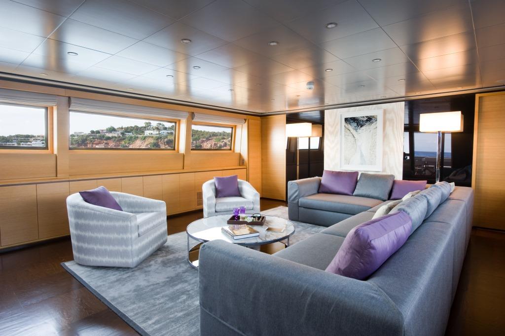The main salon offers a plush leather sofa in a cooling grey hue, 2 sumptuous occasional chairs and a glass-topped coffee table. Rich dark wood floors compliment the modern pale wood panels, while elongated side windows enhance the space, with fabulous natural light. Further forward a foyer leads to the full-beam stylish formal dining area.