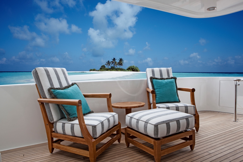 Her exterior living is over 3 teak decks and very well-appointed. Adjacent to the salon is the shaded aft deck, with alfresco dining area and wet bar with stool seating.