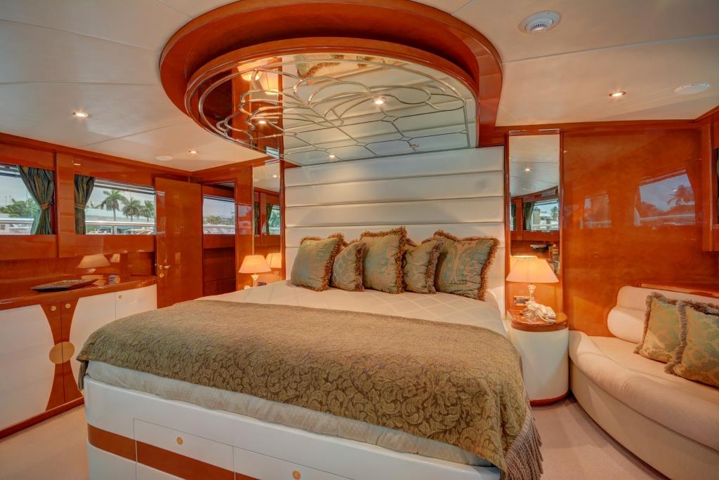 The aft deck gives direct access to the foredeck, where a comfortable seating space and raised sunpad, are ideal for soaking up the warmth. Her upper deck offers partial shade, an alfresco dining table, seating, wet bar and clear drop down weather windows. Aft of this area is a deluxe Jacuzzi.