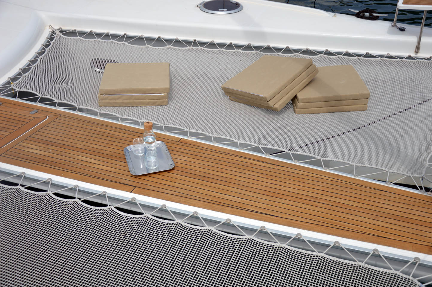 The helm controls are raised to starboard, and on both sides walkways lead around to the foredeck where there are two trampolines with headrests available for sunbathing in comfort.