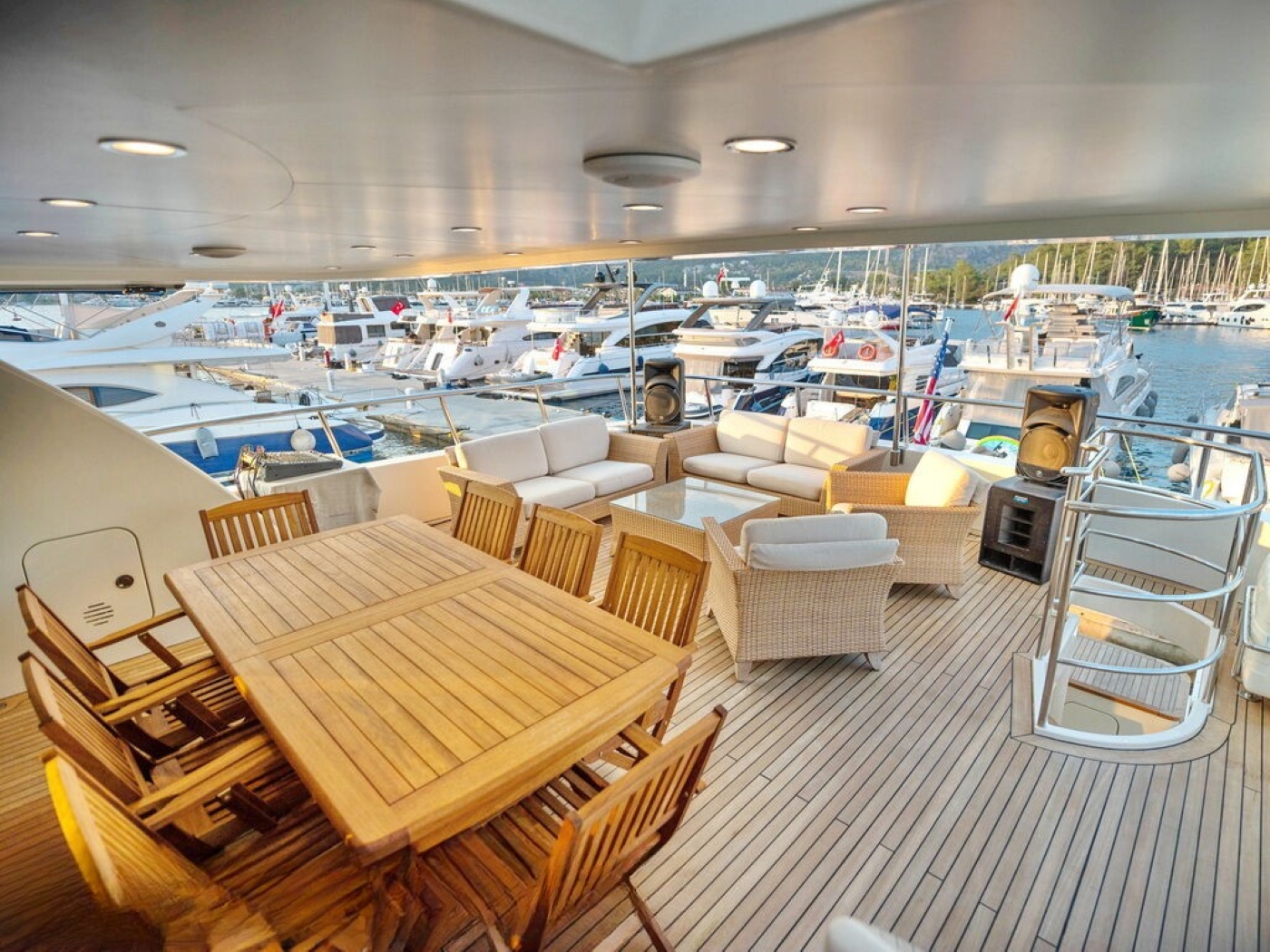 Forward in an open plan is the formal dining table, easily seating 8 guests in comfort and style. The master stateroom is on the main deck forward of the salon, while 3 additional guest cabins are on the lower deck.