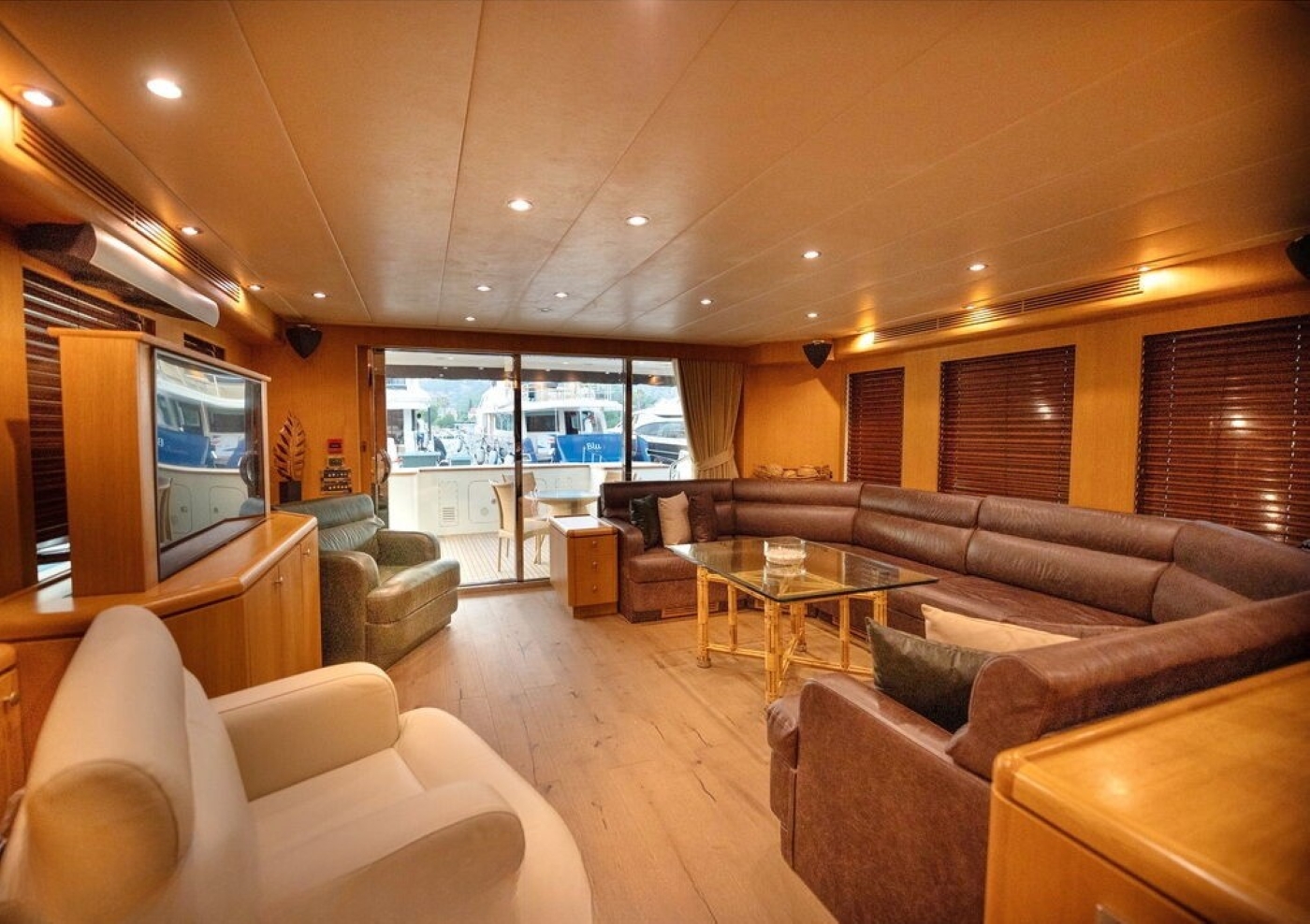 On the main deck is a generous salon with a plush leather sofa, coffee table and full entertainment systems. Forward in an open plan is the formal dining table, easily seating 8 guests in comfort and style. The master stateroom is on the main deck forward of the salon, while 3 additional guest cabins are on the lower deck.