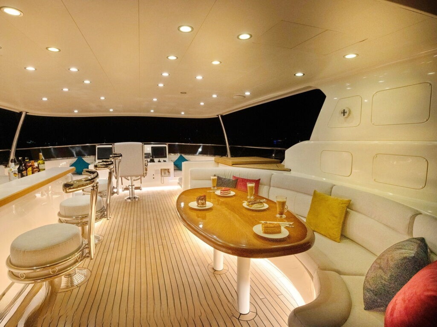 A central stair case leads from the salon into the upper skylounge, with a sofa, coffee table, entertainment and full wet bar creating the perfect social space. Both the main deck and the skylounge offer a convenient day head on the starboard side.