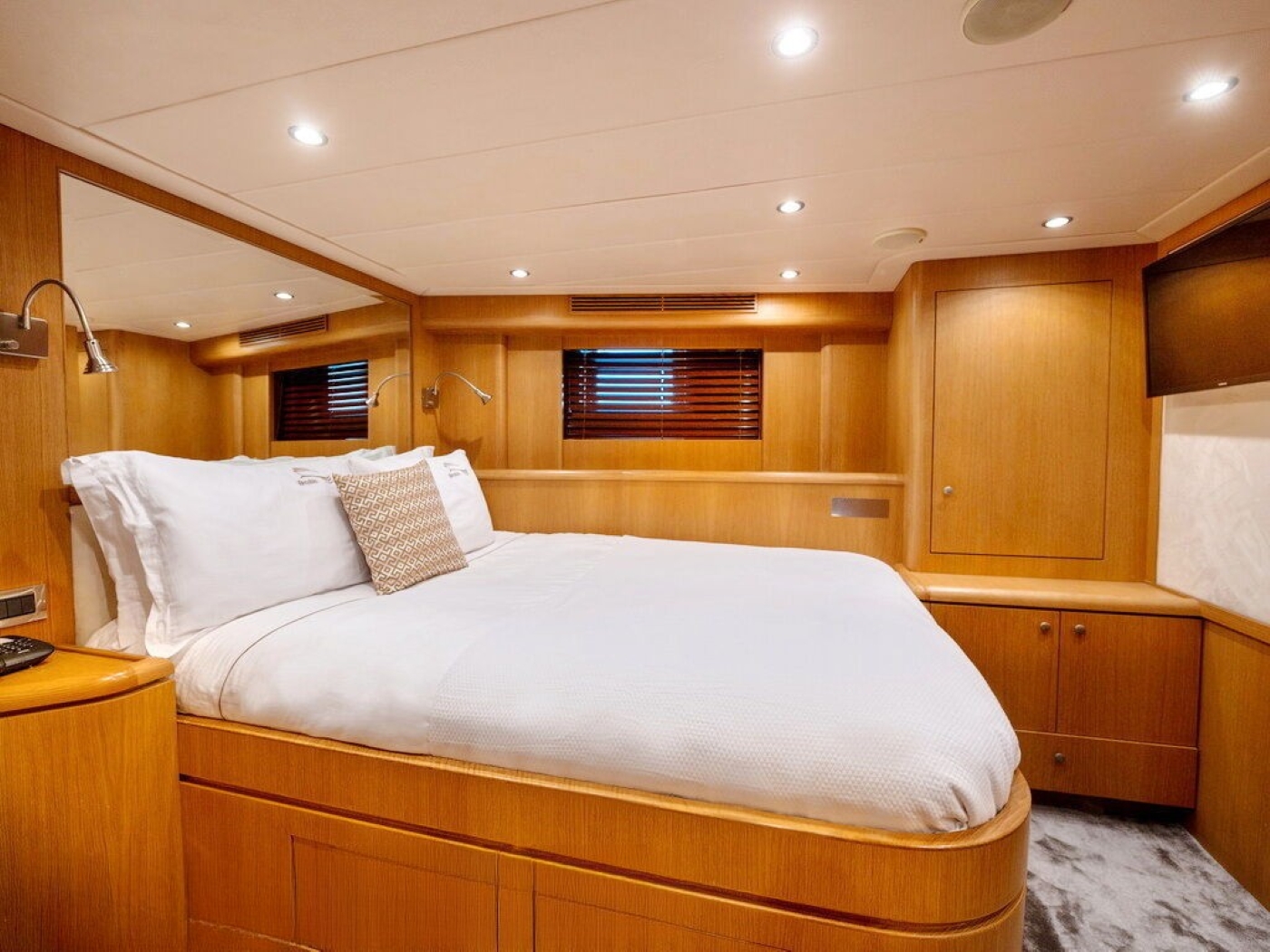 The master stateroom is on the main deck forward of the salon, while 3 additional guest cabins are on the lower deck. A central stair case leads from the salon into the upper skylounge, with a sofa, coffee table, entertainment and full wet bar creating the perfect social space.