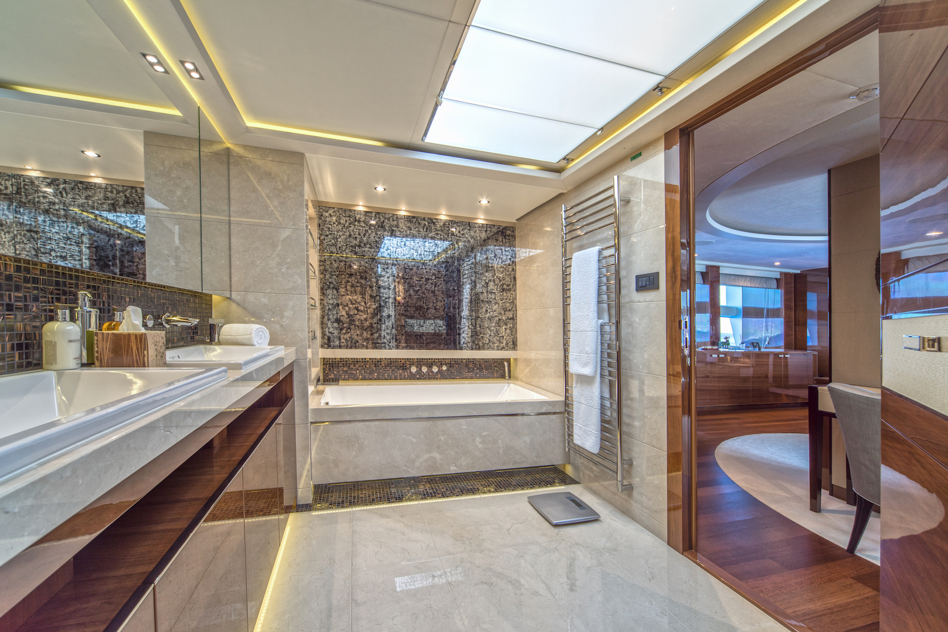 These include a lavish master suite with an office and a spacious deluxe en suite bathroom, 2 VIP staterooms, as well as 2 twin guest cabins. Moreover, guests are pampered by a highly professional crew of 7 members.