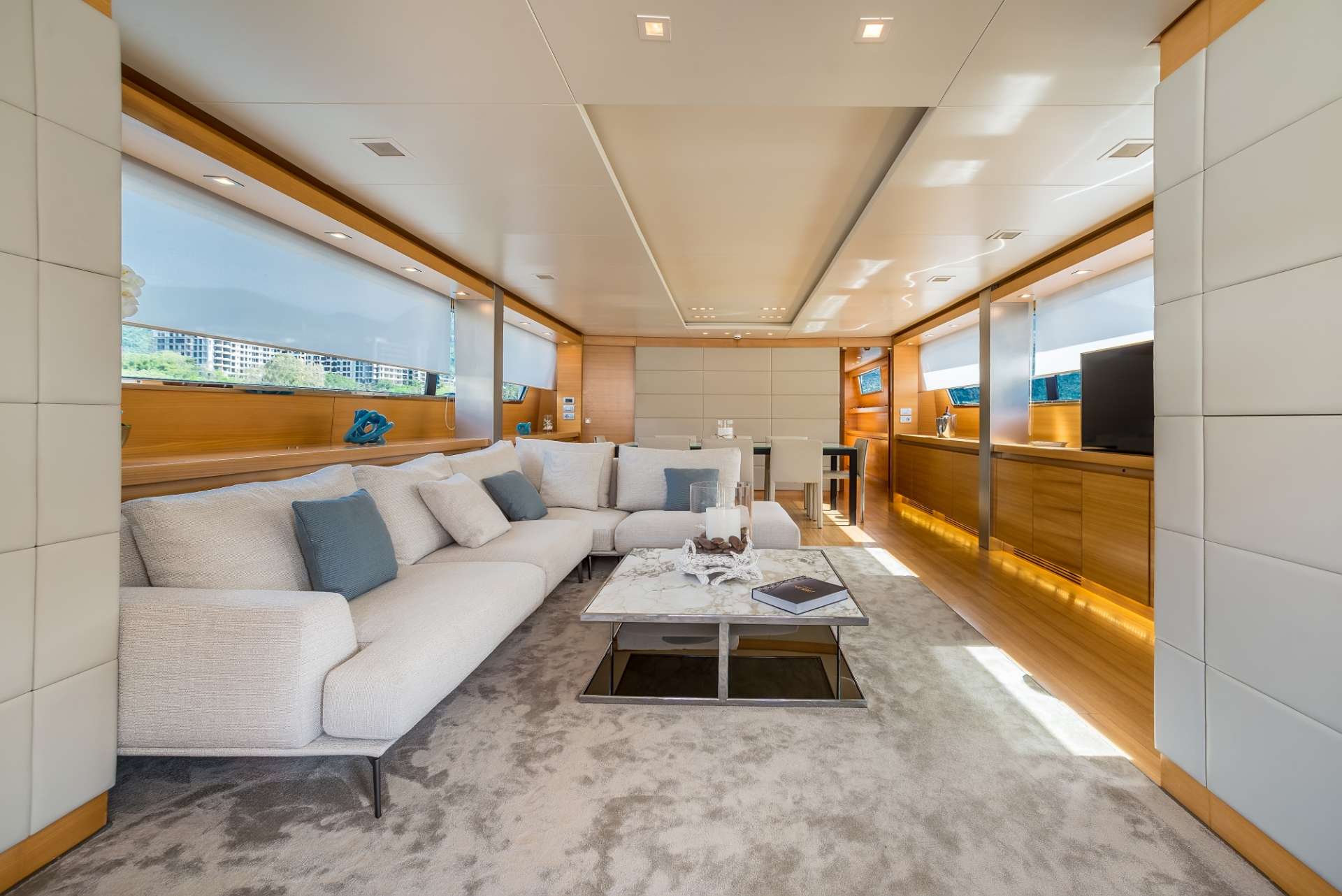 Thanks to the panoramic windows, the salon has a fabulous open and airy atmosphere, perfect for socializing. Guest accommodation is in one master cabin on the main deck forward, and 3 guest cabins on the lower deck.