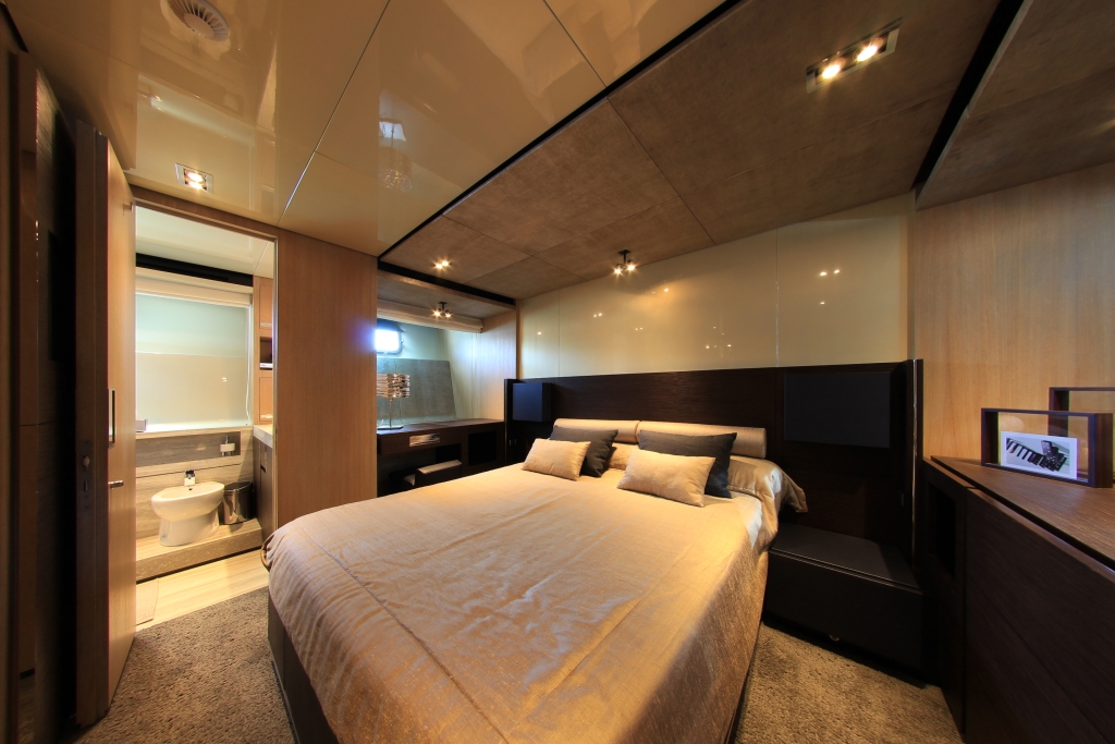 Centered on the main deck is a day head and stairwell to 4 well-appointed guest cabins on the lower deck.