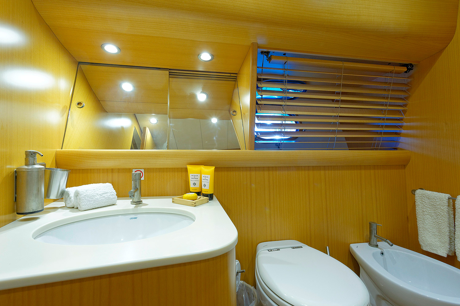 Luxury motor yacht MINOU offers accommodation in 4 en-suite cabins, for up to 10 charter guests. The master stateroom is amidships and full beam of the yacht, with a center lined king size bed. The VIP cabin features a queen size bed. Two guest cabins offer side by side twin beds.