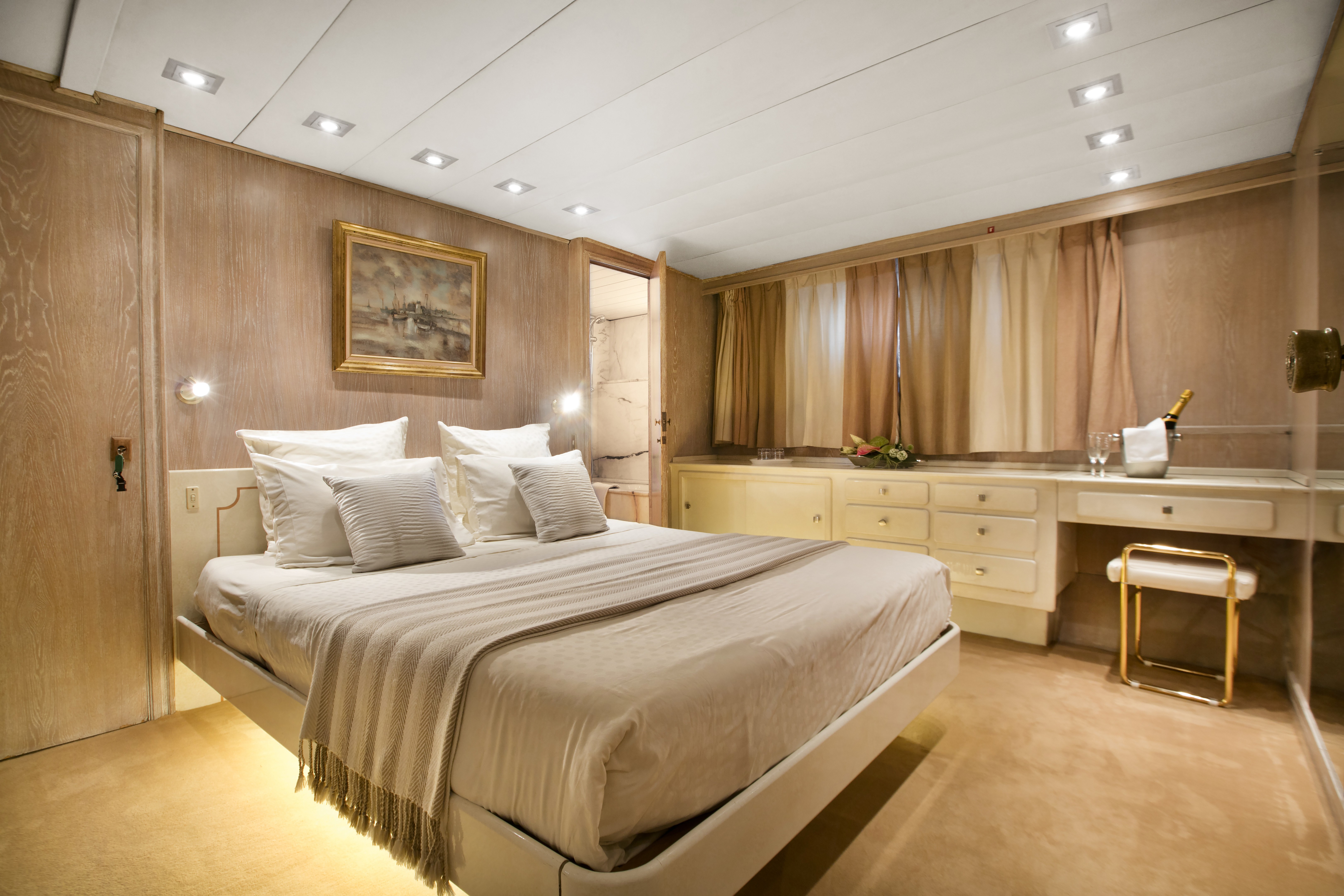 The main salon features timeless wood floors and panels and sumptuous soft leather furnishings. With the formal dining area forward in an open plan, the salon and dining space is ideal for entertaining. Surrounding panoramic windows ensure optimal natural light and spectacular views.