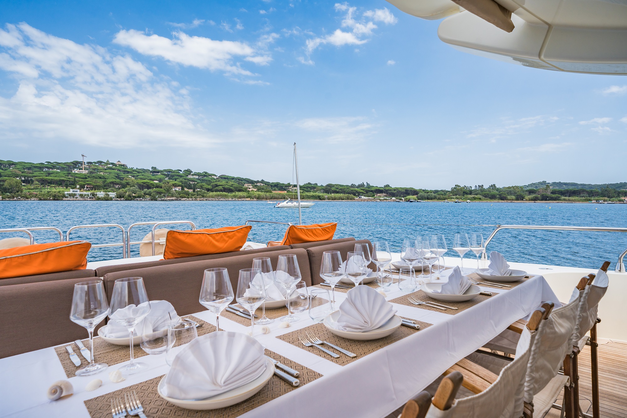The aft deck features an alfresco dining option, large raised sunpad and removable shade. Further aft is a full beam extended swim platform, providing guests with effortless access, to the great water toys on offer. The main deck wraps around the yacht 360°, leading to a capacious foredeck and additional built in large sunpad.