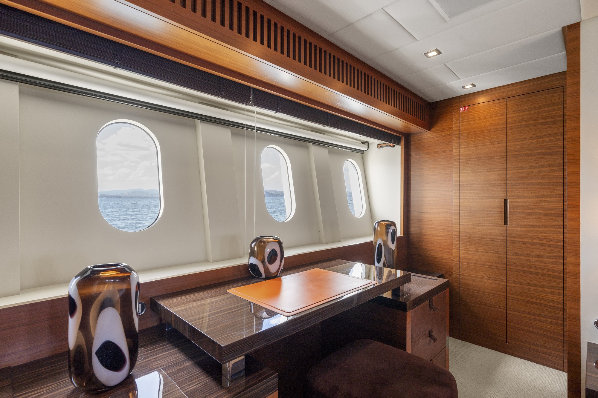 Charter yacht ECLAT offers sumptuous interior living areas. Dark wood floors, medium toned wood panels and crisp white lining compliment the plush neutral soft furnishings.