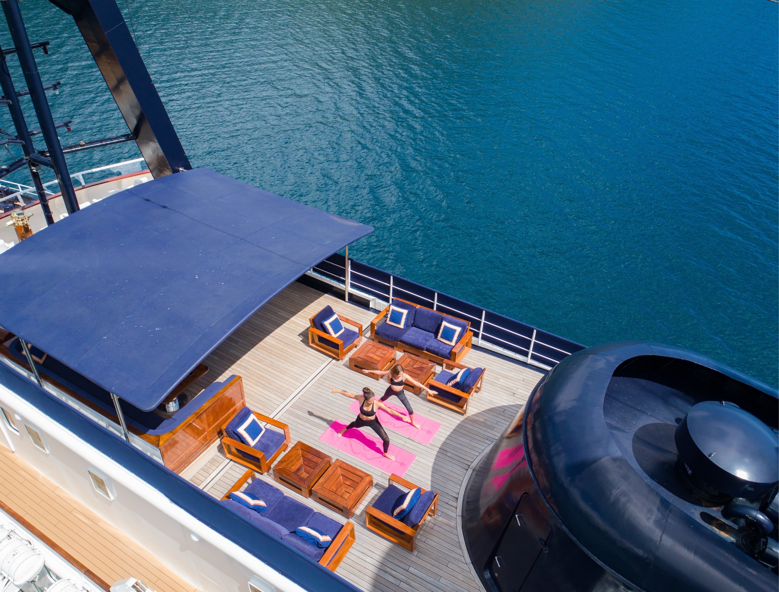 The bridge deck aft is tailored for al fresco dining, complete with a large table, integrated lounge seating, and unobstructed views.