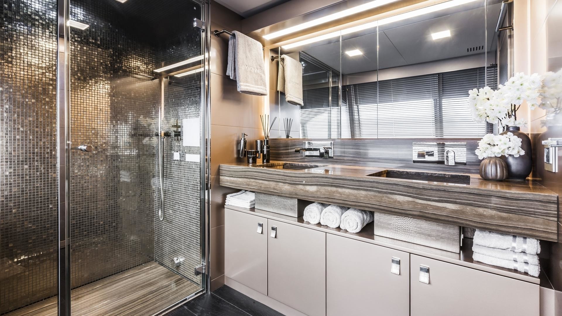 There is also an amazing sun deck, hosting a controlled-temperature Jacuzzi aft, as well as a wonderful selection of water toys, including Seabobs, water-skis, paddleboards and a doughnut.