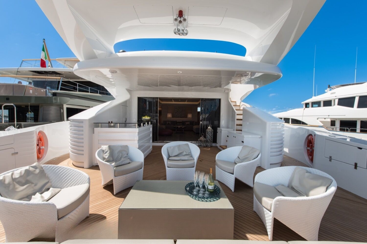 In addition, there are 4 en-suite guest cabins below deck, with the crew quarters, including a fully equipped kitchen and many service compartments, positioned in the bow area. The vessel also boasts a gorgeous fitness area.