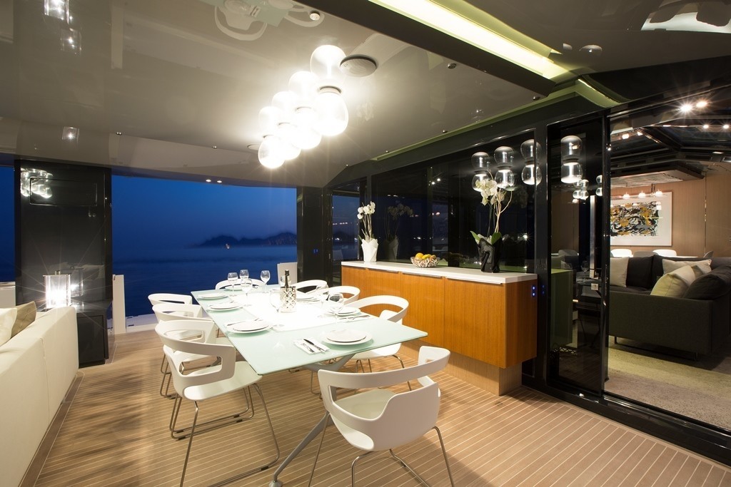 The interior effortlessly flows to the exterior thanks to plenty of windows and natural light. The main salon offers a plush seating area, coffee table and entertainment systems. A contemporary décor and well-appointed lighting, creates an elegant yet relaxed atmosphere.