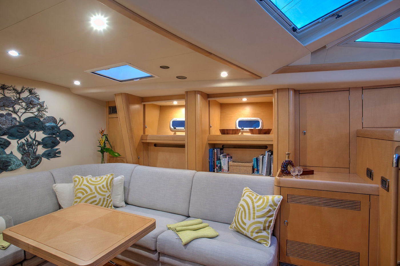 An upper salon boasts wrap around windows and stunning views, the perfect area to enjoy a social dinner and entertain. The lower salon is spacious and comfortable, ideal for relaxing at any time of the day or night.