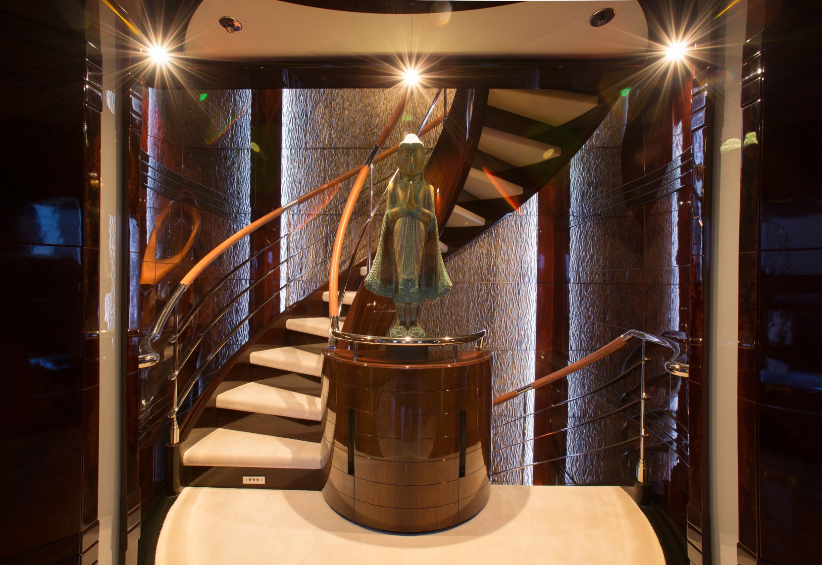 Some luxurious wood elements, custom-made furniture and Asian artwork, create a relaxed and inviting ambience.