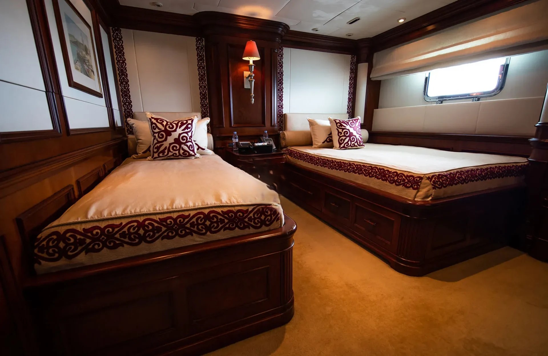 Accommodation onboard is provided for up to 12 guests in 6 cabins.
