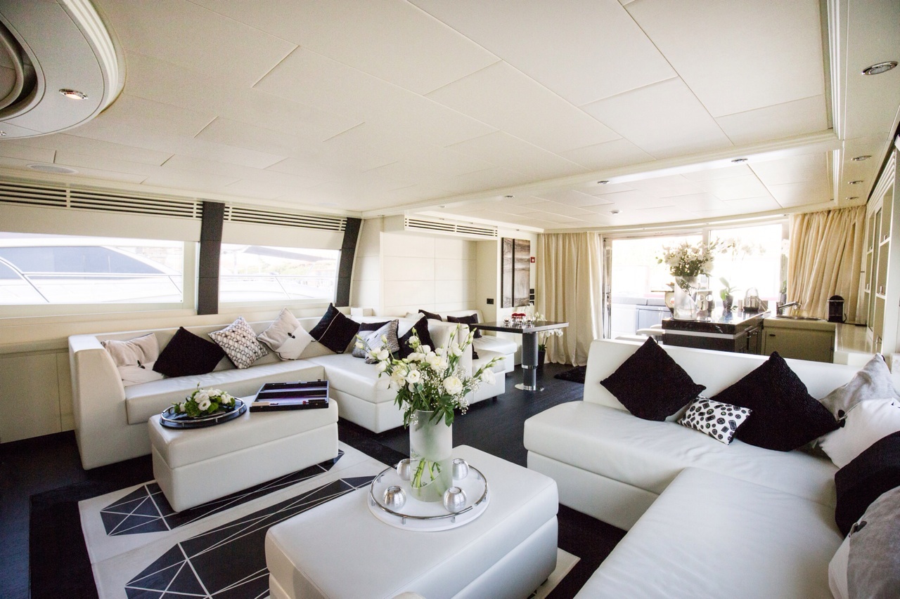 The main salon is on the main deck featuring a sumptuous lounge, with apposing crisp white sofas, ottomans, bar area and cocktail table. Dark floors contrast the subtle cream lining and white soft goods, creating a sophisticated style.