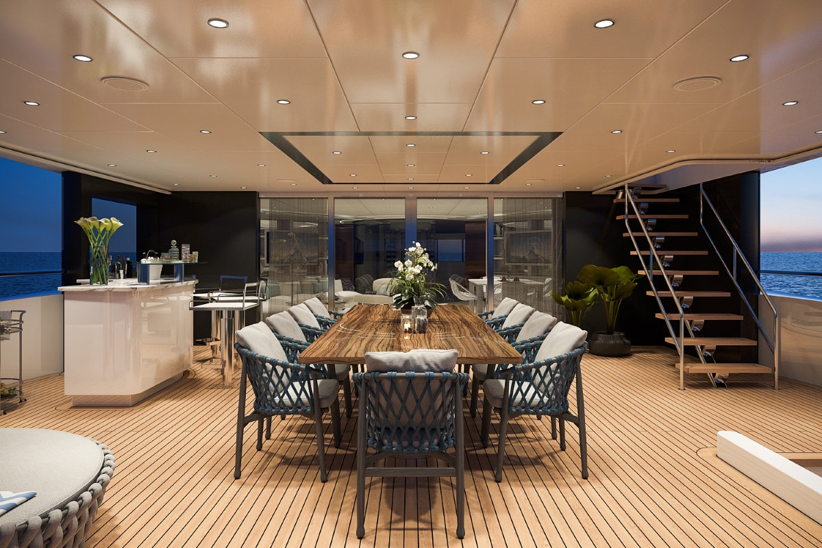 She features exterior design and naval engineering by Unique Yacht Design and elegant interiors by H2. Accommodation onboard is offered in five cabins for ten charter guests.